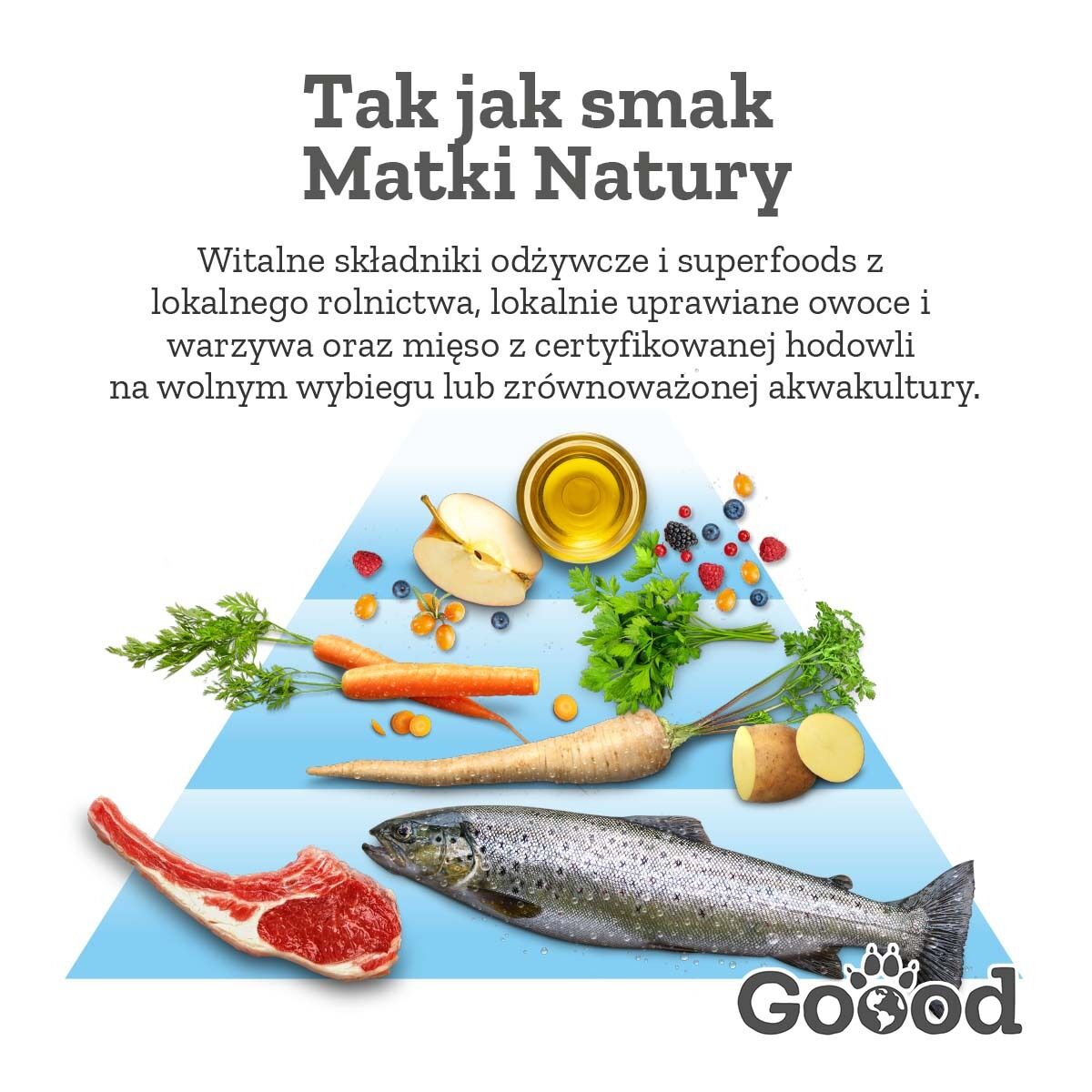 białko jagnięce* z wolnego wybiegu (18 %), mąka kukurydziana, kukurydza pełnoziarnista, białko ziemniaczane*, oleje i tłuszcze (11 %), ziemniak* (9,5 %), mączka z mięsa pstrąga ze zrównoważonej hodowli (6,5 %), wysłodki buraczane suszone, białko hydrolizowane, wytłoki jabłkowe* (1,25 %), lignoceluloza, chlorek potasu, malina* (0,28 %), borówka* (0,28 %), czarny bez* (0,28 %), rokitnik zwyczajny* (0,28 %), drożdże* (wyciąg 0,2 % = 0,04 % mannan-oligosacharydy), chlorek sodu (z soli morskiej), marchew* (0,2 %), ziemniak* (0,2 %), korzeń pietruszki*, cykoria w proszku (0,15 % = 0,01 % inulina), natka pietruszki* (0,07 %) (mieszanka owoców jagodowych razem 1,1 %, mieszanka warzyw regionalnych razem 0,7 %)