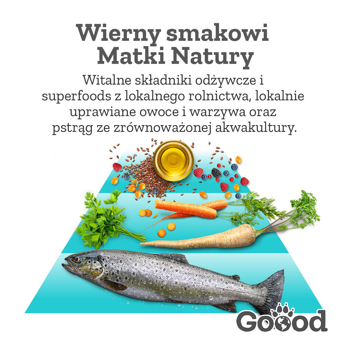 ziemniak*, produkty uboczne pochodzenia roślinnego, mączka z mięsa pstrąga ze zrównoważonych hodowli (17,5 %), hydrolizat wątroby, olej słonecznikowy (1,6 %), siemię lniane (1,2 %), olej rzepakowy (0,4 %), chlorek sodu, marchew*, pasternak*, korzeń pietruszki* (0,2 %), natka pietruszki*, mięso małży* (0,07 %); * suszona/y/e.