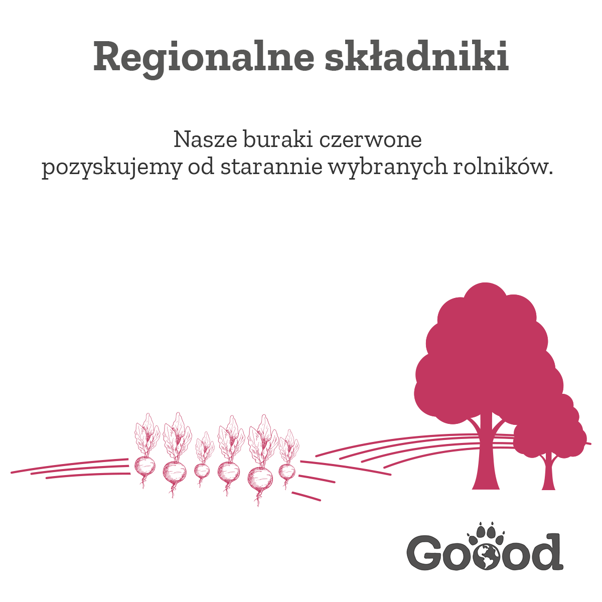 Prebiotyczna przekąska treningowa z buraków oparta jest na w 100% wegańskiej i lekkostrawnej recepturze. Zawarte w niej oligosacharydy mannanu (MOS) wspierają florę jelitową i nie zawierają dodatku cukru, barwników, aromatów ani konserwantów. Oznacza to, że smakuje nawet wrażliwym psom z nietolerancją pokarmową. Ze względu na średniej wielkości krokiety w kształcie serca, Gooodies są idealne jako nagroda treningowa.