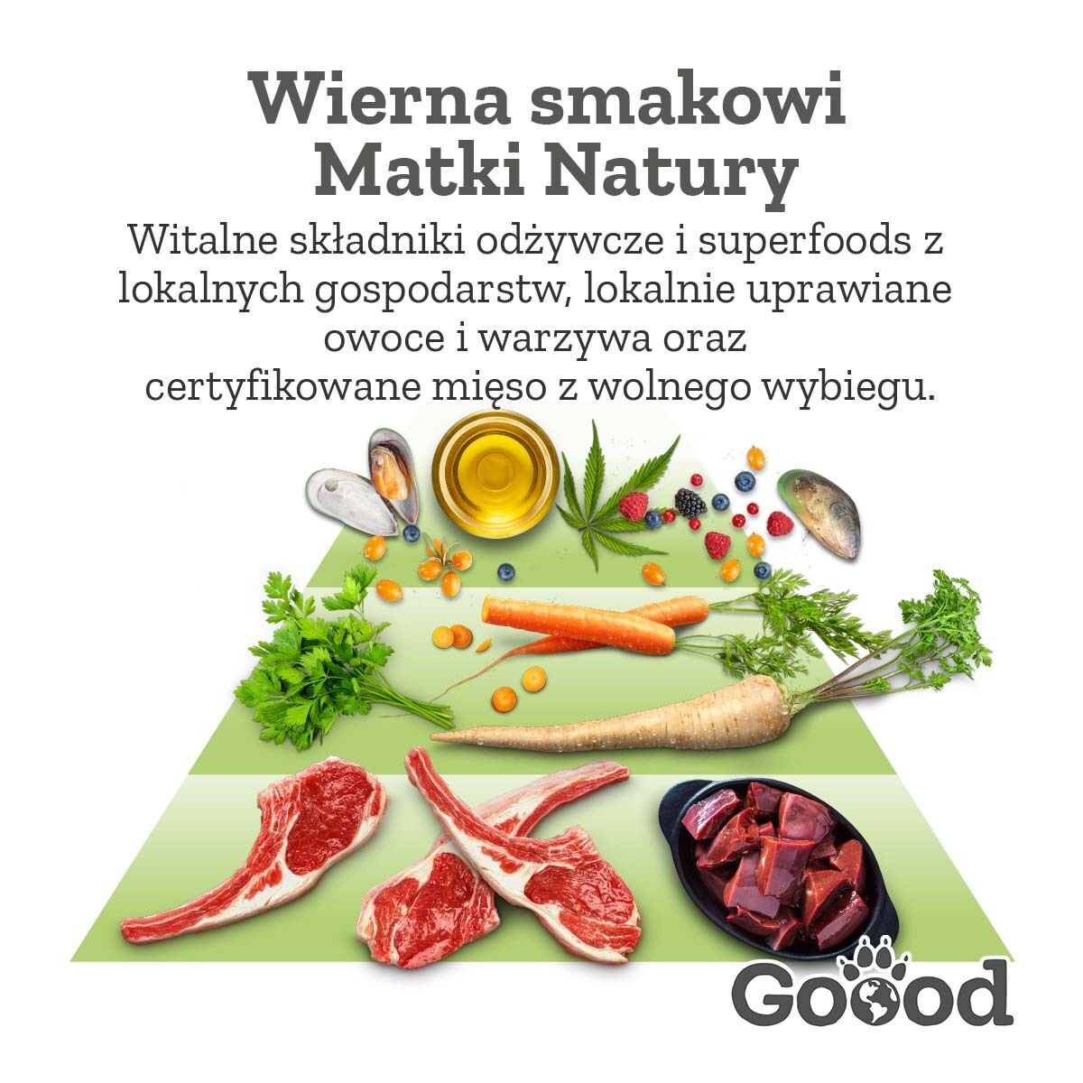 ziemniak*, białko jagnięce* z wolnego wybiegu (25 %), oleje i tłuszcze (8 %), białko ziemniaczane*, wysłodki buraczane suszone, lignoceluloza, białko hydrolizowane, wytłoki jabłkowe*, malina* (0,28 %), borówka* (0,28 %), czarny bez* (0,28 %), rokitnik zwyczajny* (0,28 %), chlorek sodu (z soli morskiej), marchew* (0,2 %), pasternak* (0,2 %), korzeń pietruszki*, małża w proszku (0,1 %), glukozamina (0,1 %), natka pietruszki* (0,07 %), mąka konopna (0,04 %) (mieszanka owoców jagodowych razem 1,1 %, mieszanka warzyw regionalnych razem 0,7 %)