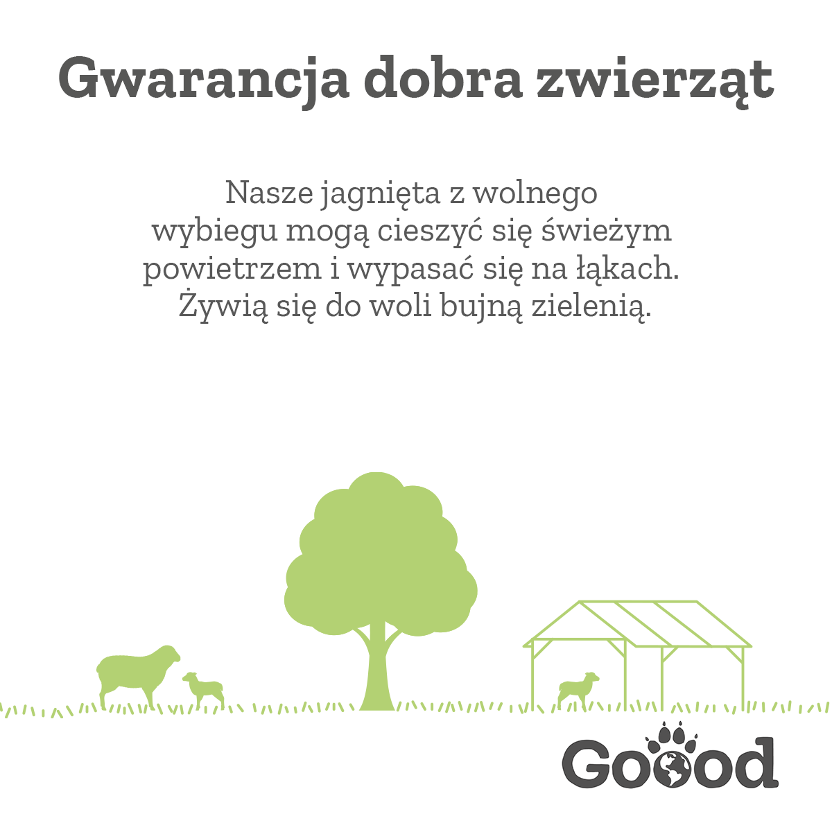 Jagnięcina zawiera zdrową porcję białka i ważnych minerałów, takich jak żelazo i wapń. Nasze owce i jagnięta mogą korzystać ze świeżego powietrza i wypasać się na łąkach przez cały rok. Ponieważ nasza jagnięcina pochodzi wyłącznie z kontrolowanych hodowli z wolnego wybiegu. Marchew i pasternak pochodzą bezpośrednio z naszej ojczyzny. Bezzbożowa receptura jest dopasowana do potrzeb większych psów. Nie potrzebuje dodatku cukru ani sztucznych barwników, aromatów czy konserwantów. Nawet jeśli Twój pies ma nietolerancje pokarmowe, polubi naszą lekkostrawną karmę.